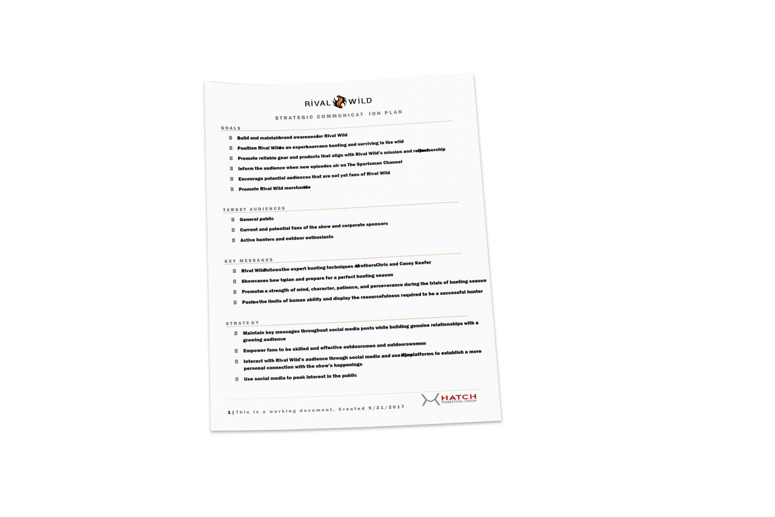 I created this communications strategy for Rival Wild, a TV show client for Hatch Marketing Group. This plan focuses on social media strategy and paid advertising, as well as relevant hashtags and a strict episode release schedule.